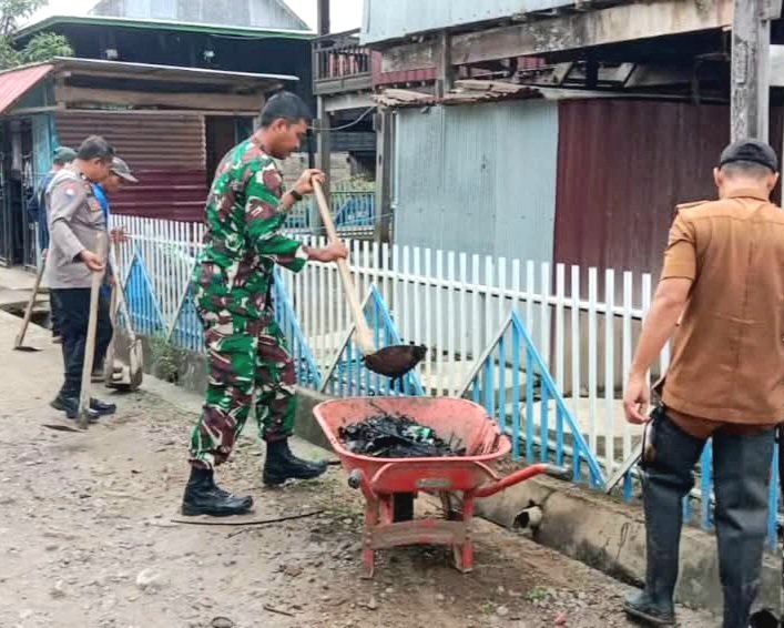 Terlihat Babinsa bersama Bhabinkamtibmas dan warga setempat bahu-membahu membersihkan saluran air dari tumpukan sampah hingga lumpur yang mengendap di dalam selokan yang menyebabkan air tidak mengalir dengan lancar.