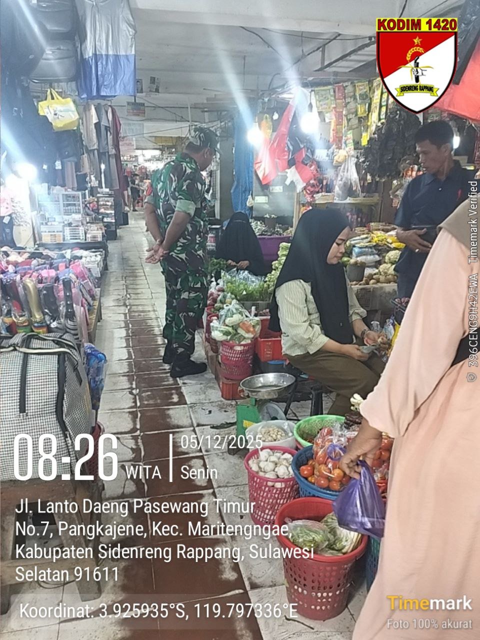 INTELEKTUALIS.Com—Sidrap, Di tengah fluktuasi harga bahan pokok, kehadiran aparat TNI di pasar tradisional menjadi angin segar bagi warga. Senin pagi (12/5/2025), Sertu Suburhan Suwandi, Babinsa Kelurahan Pangkajene dari Koramil 1420-03/Maritengngae, terjun langsung ke Pasar Sentral Pangkajene untuk memantau harga dan stok sembako.
