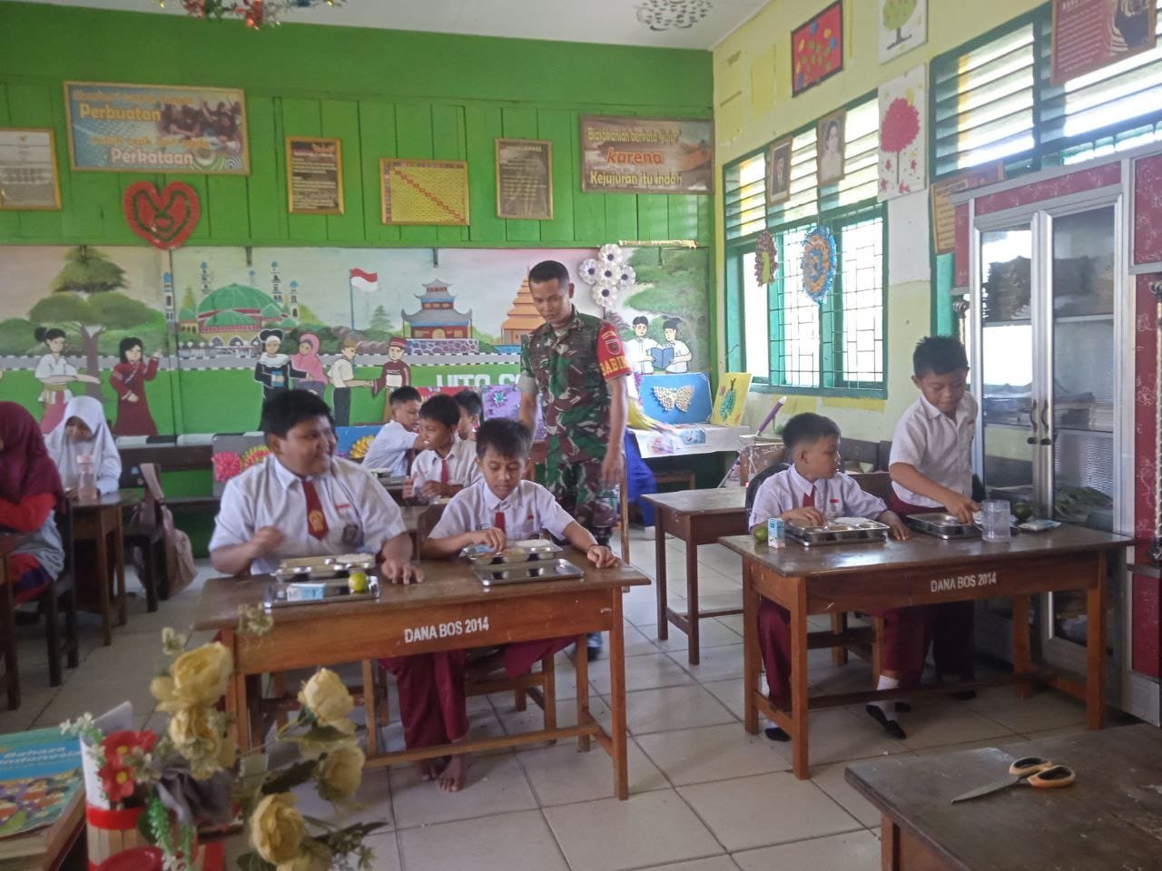 Babinsa menyampaikan bahwa pendampingan pelaksanaan Makan Bergizi Gratis (MBG) ini bertujuan memastikan kelancaran pembagian makanan sekaligus memberikan edukasi kepada para siswa mengenai pentingnya pola makan sehat.