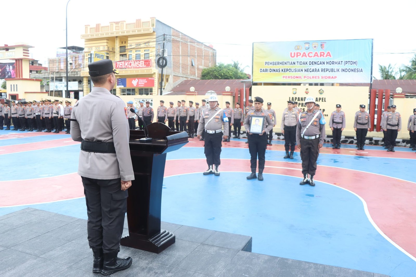 Upacara ini digelar dengan penuh khidmat di halaman Mapolres Sidrap pada Rabu pagi dan diikuti oleh para pejabat utama, perwira, serta personel Polres Sidrap. PTDH tersebut merupakan bagian dari langkah tegas Polri dalam menegakkan disiplin, integritas, dan profesionalisme anggota dalam melaksanakan tugas sebagai pelindung, pengayom, dan pelayan masyarakat.
